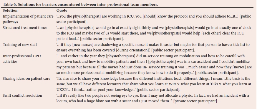 RESULTS. Twenty-two junior and 17 senior ICU physiotherapists participated in the study. Barriers raised by physiotherapists regarding communication with inter-professional team members in the ICU were non-ICU trained staff working in ICU, personality types, lack of professional etiquette, and frequent rotation of ICU staff. Enablers of communication with inter-professional team members were presence of team members in ICU during the day, good time management, teamwork approach to care and sharing of knowledge. Differing paradigms of teamwork among health professionals was highlighted as a cause of tension in the ICU inter-professional collaborations.