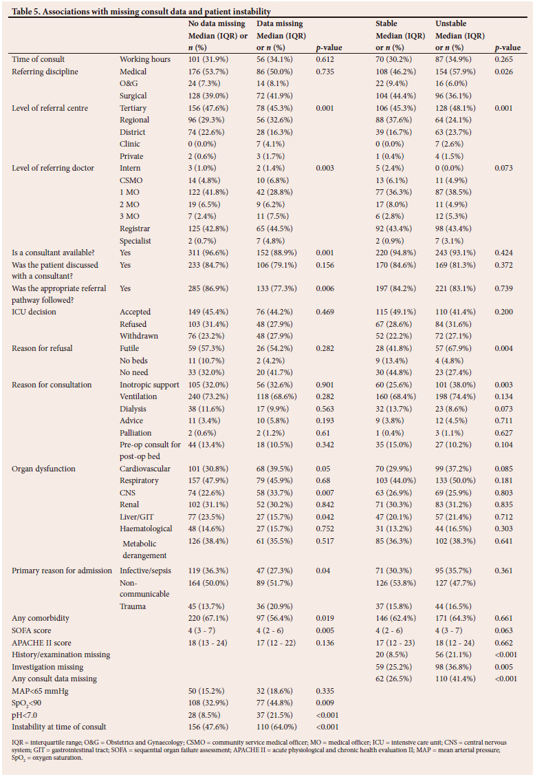 The appropriate referral pathway was significantly less likely to have been followed in patients with missing data, suggesting either knowledge or system problems being more common in these situations. Patients with missing data were significantly more likely to have central nervous system (CNS) dysfunction, which is likely due to lack of availability of computed tomography (CT) scanners in district and some regional hospitals. In general, patients with missing data tended to have fewer comorbidities and lower severity of illness scores but were more likely to be unstable at the time of consult. The latter finding likely reflects the perception that unstable patients need to be referred to ICU immediately, and therefore investigations are not performed. This misperception should be addressed with a focus on attempts at stabilisation prior to ICU referral.