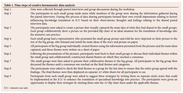 Participants were assured confidentiality as interview guides did not request names. The data were divided into themes and not associated with individual participants. Data were collected during paired interviews involving two-two ICU nurses, followed by a group discussion during a 1-day workshop held at a Health support board room. The workshop was facilitated by a senior researcher with more than 20 years of qualitative data collection and analysis experience. The participants were divided into four groups. The facilitator provided each group with flip charts to identify and document the factors influencing knowledge translation. Each group had a representative who shared their individual small group information with the big group. After sharing their views on facilitators and barriers to knowledge translation with the big group, the three groups reached a consensus on identified facilitators and barriers in knowledge translation and the facilitator consolidated the facilitators and barriers to knowledge translation into one document. Data were analysed using nine steps of creative hermeneutic data analysis (Table 1 and Table 2).[6]