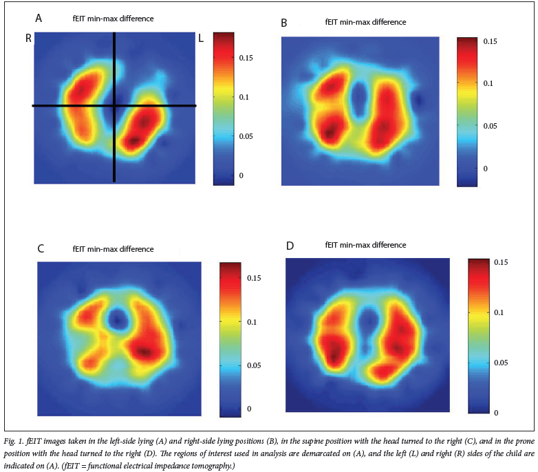 METHODS: Thoracic electrical impedance tomography (EIT) measurements were taken in left- and right-side lying, supine and prone positions in mechanically ventilated infants/children. Functional EIT images were produced, and regional relative tidal impedance (AZ) in the left, right, ventral and dorsal lung regions was calculated. The proportion of ventilation occurring in large lung regions and regional filling were also calculated
