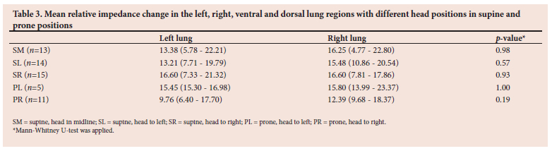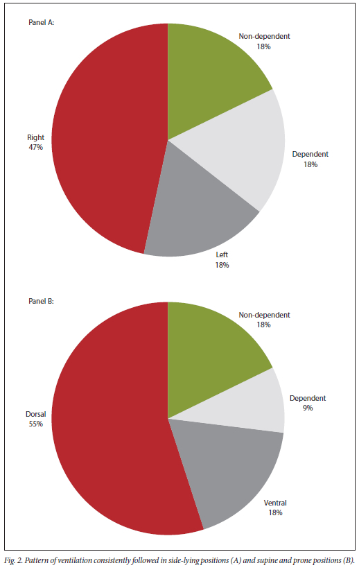 A major limitation of this study is that it is unclear which breaths were patient or ventilator driven, and this needs to be included in future studies to more accurately describe ventilation distribution in mechanically ventilated children. Whether there was hyperinflation on the chest radiograph was also not recorded. Hyperinflation may affect ventilation distribution, with a reduction in ventilation in the hyperinflated region. Although the sample size is comparable to similar studies in neonates[17,18,29,46] and was initially calculated to be adequately powered, final analysis indicated that it was underpowered (<80%). These results should therefore be confirmed in larger studies. Positioning was not absolutely standardised, although it was reproducible between participants, and this may have affected the results. The effect of time in the position and order of positions should be considered in future studies, since ventilation distribution may change over time and there may be order effects.[47] Often with a position change, secretions are mobilised and endotracheal suctioning is required. For ethical reasons, endotracheal suctioning was permitted during the study. This may have influenced ventilation distribution; the loss of PEEP during open endotracheal suction as well as the application of negative pressure may result in decruitment of lung regions.[48,49] The classification of pattern based on the 50% cut-off may have resulted in the overestimation of some patterns. Whether there is a clinically meaningful difference in the proportion of ventilation between lung regions will need to be determined in future research in children.