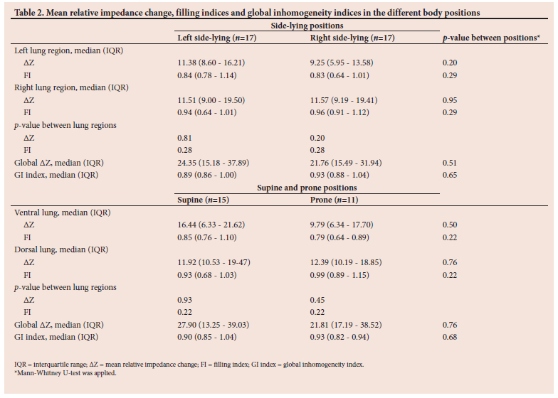 Seventeen (n=8 male) infants/children with a median age of 1.1 (range 0.5 - 5.5) years were included (Supplementary Table 1, available online at http://coding.samedical.org/file/2342). All the children received pressure-controlled synchronised intermittent mandatory ventilation. None received muscle paralysis during the study. Sixteen children (94%) received some form of sedation at the lowest dose to keep the child comfortable; this resulted in full ventilatory support in only 2 cases (12%), and the remaining children were able to trigger breaths on the ventilator. The children in this study did not have severe lung disease at the time of measurement, which was usually done towards the end of their course of MV. Thirteen children (76%) had bilateral radiographic changes, 2 had unilateral changes (on the right), and 2 had no changes. All 17 children had measurements in the side-lying positions, all 17 had at least one measurement in the supine position, and only 11 had at least one measurement in both the supine and prone positions. Inability to measure in the prone position in some children was due to newly inserted tracheostomies (day 0 or 1), or the child refusing to turn into the prone position.