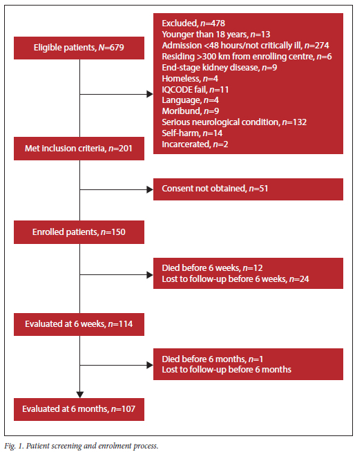 This single-centre, prospective observational cohort study screened and enrolled critically ill patients either at ICU discharge or shortly thereafter in the ward. The current study constituted a component of a broader study that investigated the physical, mental, and cognitive after-effects in ICU survivors at 6 weeks and 6 months after hospital discharge. Inclusion criteria were: age >18 years and the requirement of >48 hours admission to ICU either for respiratory support (invasive or non-invasive mechanical ventilation; or high-flow humidified nasal oxygen (HFNO)); or shock requiring vasopressor support; or management for any other organ failure. Patients were ineligible for inclusion if any of the following factors were present: they were prisoners; had a life expectancy gauged to be less than 6 months; resided more than 300 km from the enrolling centre; were unable to be interviewed in English or isiXhosa; had active or recent psychosis; were admitted for self-harm or with central neurological pathology; or had preexisting cognitive impairment (as determined by the Short Informant Questionnaire on Cognitive Decline in the Elderly (IQCODE).[12] Patients were also excluded from the final data analysis if they did not survive until the 6-month follow-up or did not complete the 6-month study assessment.