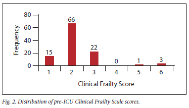 A comparison of the main characteristics (sex, age, diagnostic category, work status, severity of disease, frailty and co-morbidities and length of ICU stay) between the study group and those lost to follow-up, did not show any significant differences (Supplementary Table S1; http://coding.samedical.org/file/2375). A total of 107 patients completed the 6-month follow-up visit and were included in the final analysis. The demographic and clinical characteristics of the cohort are presented in Table 1. The cohort reported a low preadmission CFS (Fig. 2).