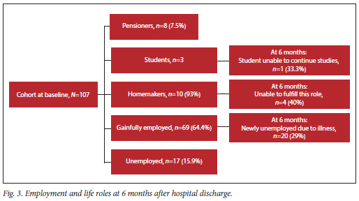 Patients were followed up at 6 weeks and 6 months post hospital discharge. At these visits the SF-36 questionnaire was repeated and information collected encompassed the return to previous life roles including employment, studying and home making, as well as reasons for being newly unemployed. The patients' level of functioning was determined by completion of the Lawton Instrumental Activities of Daily Living score (IADL) which is sensitive to early cognitive decline and subtle dysfunction.[17] A fully functional person scores a maximum of eight points. A change in two or more IADL dependencies is considered significant and ensures that the measured dysfunction is meaningful to patients and caregivers.[18,19]