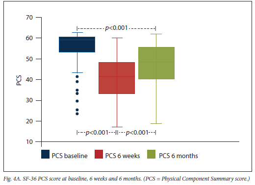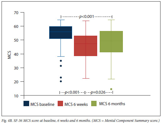 The employment and life roles at baseline and 6 months are depicted in Fig. 3. The cohort included 8 pensioners and 3 students. None of the patients who were students had returned to their studies at 6 weeks after hospital discharge, and by 6 months, one still had not returned. There were 10 homemakers in the cohort, and at both follow-up visits, 4 (40%) of them were unable to fulfil this role. Prior to admission, 69 patients (64.5%) were engaged in remunerative employment. At the 6-week and 6-month study visits 39 (56.5 %) and 23 (33.3%), respectively, of the previously working patients were newly unemployed. Overall, 34% of patients had not returned to their previous remunerative work, studying or home making by 6 months. The study coincided with the COVID-19 pandemic and the impact of COVID-19 on employment was considered. The study period overlapped with the highest unemployment rates recorded to date in SA (30 - 35%).[20] However, only 3 of the newly unemployed patients indicated that the negative change in their employment status was the result of redundancy. Therefore, 20 (29%) of previously employed survivors were unemployed at 6 months due to ill health. Of the patients who had returned to work by 6 months, 19 (27.9%) took longer than 6 weeks to do so. Only three of the newly unemployed patients were receiving a disability grant 6 months after discharge. Those with a non-COVID-19 admission diagnosis were more likely to be newly unemployed at 6 months than those with a COVID-19-related admission. The unemployment rate was 18.2 % among patients admitted with COVID-19, 33% among those with other medical diagnoses, 44% among those with a surgical admission diagnosis and 35.3% among patients admitted for trauma. The impact of the patients' physical health on HRQOL was measured by the SF-36 physical component summary score (PCS). The cohort's median (IQR) SF-36 PCS score at baseline (pre-morbid) was 59.2 (53.4 - 60.8). There was a significant improvement in the median (IQR) PCS score from 6 weeks (41.2 (33.0 - 48.4)) to 6 months (48.4 (40.3 - 55.7)), however, both scores were significantly lower compared with the baseline score (Fig. 4A). The impact of the patients' mental health on the HRQOL was measured by the SF-36 mental component summary score (MCS). The median (IQR) SF-36 MCS score at baseline was 56.3 (51.1 - 61.2). At the 6-week and 6-month visits, the median (IQR) MCS scores were 47.5 (38.4 - 53.5) and 49.7 (41.3 - 56.8), respectively, and these were significantly lower than the baseline measurement (Fig. 4B).