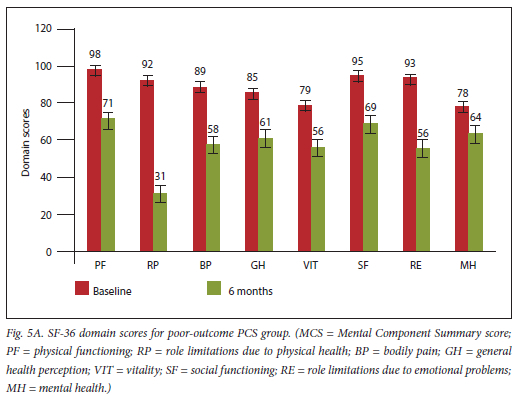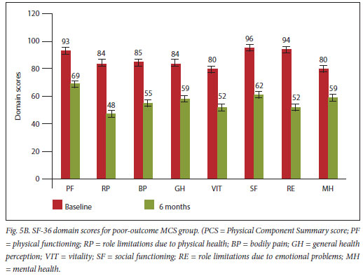 Using a minimal clinical difference of 5 or more points, 12 patients reported a significantly better PCS at 6 months compared with their baseline, while the same was reported by 15 patients in terms of their MCS comparison. The baseline v.6-month SF-36 domain scores for the poor PCS and MCS groups are depicted in Figs 5A and 5B.