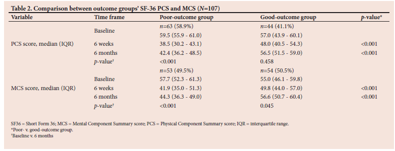 At 6 months, 63 (58.9%) of the survivors had a significantly lower mean PCS, as defined by a negative score change of 5 or more (hereafter referred to as the 'poor' group), while 53 (49.5%) had a poor mean MCS at the same study visit. Overall, 67 (62.6 %) of survivors had either a low PCS and/or a low MCS at 6 months. There was considerable overlap between patients with a poor PCS and MCS: 47 patients (43.9%) of the survivors had lower scores for both. Table 2 compares the PCS and MCS scores of poor and good outcome groups. A poor 6-month PCS was associated with an admission diagnosis of trauma (86.4% of those admitted with a diagnosis of trauma had a poor outcome, compared with 53.1% of those with medical emergencies and 47.6% of those with surgical emergencies (p=0.012). A higher median (IQR) Charlson Comorbid Index (CCI) was also associated with poor PCS (p=0.044). However, due to the overall low values for the CCI and distribution of the data, the median (IQR) scores of both outcome groups were 0 (0 - 1) for poor v. 0 (0 - 0) for good.
