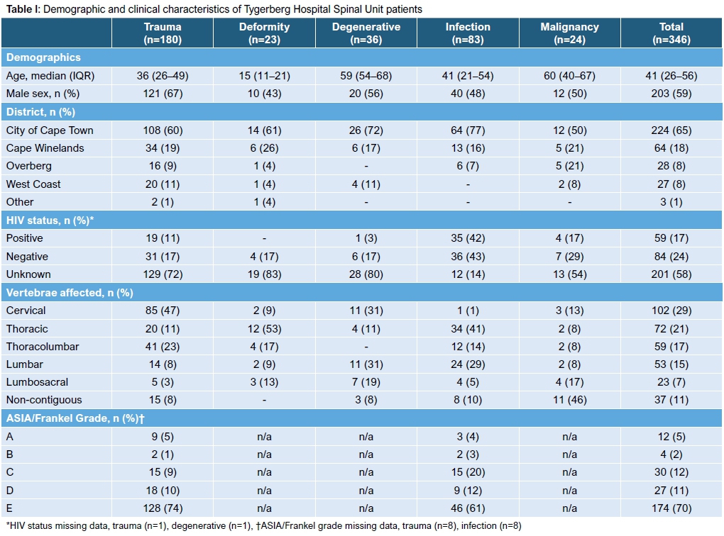 The first finding of the study was that the Orthopaedic Spinal Unit at Tygerberg Hospital experienced a substantial patient burden over the one-year study period, including 349 individual patients and 376 separate admissions. The clinical profile of spine patients was dominated by trauma and infection, with these subgroups accounting for 51% and 24% of all spine pathology, respectively.