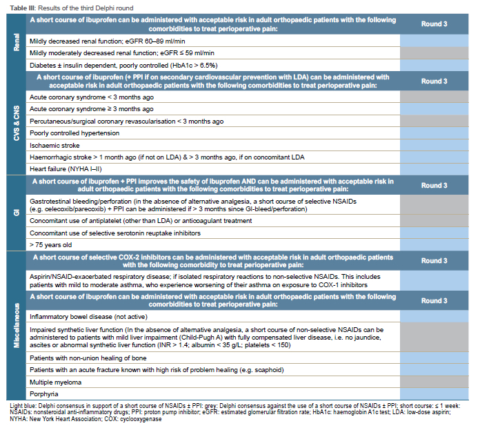 In conclusion, our multidisciplinary Delphi group achieved consensus on safe short-term NSAID treatment in 42 patient characteristics in adult orthopaedic patients. The results were translated into an NSAID decision tool intended to aid clinicians in safe prescribing of NSAIDs as part of a multimodal analgesic strategy to improve postoperative pain control and hence quality of recovery.