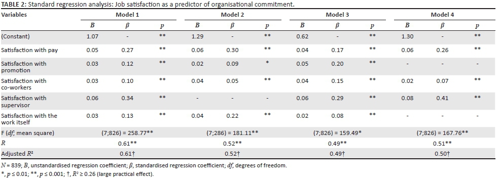 The JS variables of satisfaction with pay, satisfaction with co-workers and satisfaction with supervisor produced a statistically significant regression model (F(7, 826) = 167.76), accounting for 51% (R2 = 0.50; p ≤ 0.001; large practical effect) of variance in overall commitment. More specifically, satisfaction with supervisor (β = 0.41; t = 11.66; p ≤ 0.001), satisfaction with pay (β = 0.26; t = 8.06; p ≤ 0.001) and satisfaction with co-workers (β = 0.07; t = 2.27; p ≤ 0.001) contributed significantly towards explaining the proportion of variance in the total commitment variable.