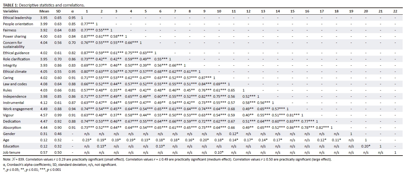 Table 1 presents the means, standard deviations, Cronbach's alpha and correlations of the study variables, namely EWC, ELB and WE. In terms of the ECQ variables, instrumental obtained the highest mean score (mean[M] = 4.12; standard deviation[SD] = 0.61), followed by law and codes (M = 4.08; SD = 0.64), total EWC (M = 4.05; SD = 0.55), rules (M = 4.03; SD = 0.66), caring (M = 4.02; SD = 0.60) and independence (M = 3.98; SD = 0.85). In terms of the ELWQ ELB variables, the sample overall scored the highest on ethical guidance (M = 4.02; SD = 0.61), followed by power sharing (M = 4.00; SD = 0.63), people orientation (M = 3.99; SD = 0.63), role clarification (M = 3.95; SD = 0.70), total ELB (M = 3.95; SD = 0.65), integrity (M = 3.93; SD = 0.86) and fairness (M = 3.92; SD = 0.64). In terms of the UWES variables, vigour obtained the highest mean score (M = 4.57; SD = 0.99), followed by dedication (M = 4.47; SD = 0.92) and absorption (M = 4.44; SD = 0.92). All three dimensions imply a relatively high level of WE within the sample. The participants scored relatively high on the demographic characteristics of tenure (M = 0.57; SD = 0.50) and gender (M = 0.31; SD = 0.46), and the lowest on age and education (M = 0.12; SD = 0.32).