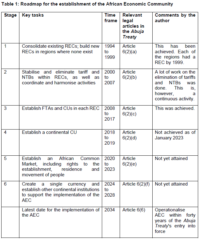 Table 1 summarises the stages outlined in the Abuja Treaty, all leading towards the attainment of the AEC. Each stage has a clear timeframe, stating what must be achieved by a certain date.58 These stages involve liberalising trade in goods, eliminating barriers to trade, and taking measures to ease the flow of goods during international trade. Most of the RECs have accomplished the first three stages, although the degree of achievement differs.