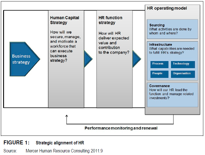 Figure 1 illustrates the relationships among business, human capital, and HR functional strategies that influence HR's operating model and inform its governance system. HR governance is an important aspect of corporate governance in general. Mervin King is of the opinion that "good human resource management is imperative for good governance" (SABPP 2009:3). Shameem (2011 :Internet) posits that "HRM has now become central to the idea of corporate governance. This is because the idea of creating institutional trust has become central to governance ideas".