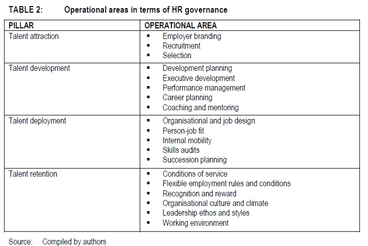 The operational areas of focus in terms of HR governance, reflected in the organisational as well as departmental strategies in terms of the overarching process of talent management, and in order to become the employer of choice, are shown in Table 2.