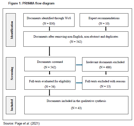 The entire search process yielded 830 sources of information from the WoS database search engine. From the 830 sources, after applying the inclusion and exclusion criteria (eligibility criteria), the researchers cleaned the data by deleting duplicates, non-English content, non-relevant information, and non-abstracts, resulting in 38 sources being considered after careful consideration and as suggested by disciplinary experts (Table 2). Moreover, as the study focused on the public sector milieu, grey literature (including government documents, such as reports, policy documents, and publications) was also considered. To this end, though, most sources consulted were peer-reviewed journal articles. Eventually, a total of 43 sources, including 35 journal articles, three conference papers and five grey literature, were included in the qualitative, document (systematic) review to derive the themes pertinent to this study. The search criteria were as follows.