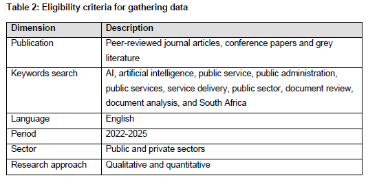 Initially, as PRISMA was employed, the literature search commenced with the comprehensive detection of AI and public sector concepts to ensure synergy and rigorous scrutiny of subject-related matters while maintaining linkage to the study's primary aim. The academic citations of the sources were retrieved from the Web of Science (WoS) search engine, a renowned database, as recommended by experts in the IS research discipline. Since digital technologies (including AI) can change over time due to unpredictable and volatile business environments, the search for the database was limited to the period ranging from 2022 to 2025. The procedure helped identify the most trending issues related to the subject matter (i.e., AI and the public sector) in the literature. Furthermore, the database search was restricted to the "AI", "artificial intelligence", "public service", "public administration", "public services", "service delivery", "public sector", "document review", "document analysis'", and "South Africa" key concepts. Considering the search outcomes from the web, various studies were chosen and systematically reviewed to detect relevant themes and terminologies, and these findings were then aligned with the study's primary aim. Additionally, to ensure the credibility and quality of the data collection process, the sources obtained were carefully assessed using intellectual analysis, classification, assimilation, and reflexivity, whereby connotations were attributed to the data (Armstrong, 2021).