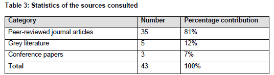 Table 3 below illustrates the statistical contribution of sources consulted, categorised by number and percentage.