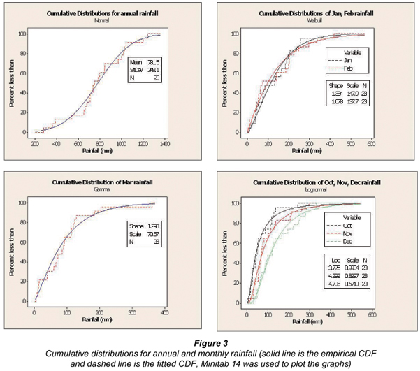 Annual and monthly rainfall data were fitted to 4 probability distribution functions, i.e. the normal, lognormal, Gamma and the Weibull distributions. The respective parameters of the distribution functions were determined and presented in Table 3. The values of the AD goodness-of-fit test and associated p-values are also presented in the table. Based on the AD goodness-of-fit and p-values, annual rainfall is best described by the normal distribution. Using the same criteria monthly rainfall is best described by the theoretical distributions as indicated in parenthesis as follows: October (lognormal), November (lognormal), December (lognormal), January (Weibull), February (Weibull), March (Gamma). Out of the considered 6 months of the rainy season, half of them are best described by the lognormal distribution. In his study in Ethiopia, Tilahun (2006) found that most of the monthly rainfall was best described by the lognormal distribution and annual rainfall by the Weibull, Gumbel and Gamma distribution. In semi-arid Kenya the annual rainfall could be approximated by a normal distribution (Rowntree, 1989). Figure 3 shows the fitted CDF curves.