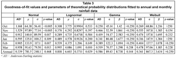 The statistical parameters for both the annual rainfall and monthly rainfall data are summarised in Table 2, where the mean, standard deviation, coefficient of variation, skewness and kurtosis are given. The skewness and kurtosis coefficients for a normal distribution are zero or near zero. Skewness and kurtosis coefficients indicated that annual rainfall approximated a normal distribution. This was further confirmed by the p-value (0.468) of the Anderson-Darling (AD) test (Table 3). The data indicated that monthly rainfall was strongly skewed to the right (high positive values of skewness coefficients) and highly leptokurtic, a phenomenon common in semi-arid regions.