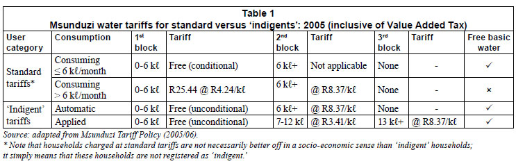(all figures include Value Added Tax). In 2004, with the introduction of the Indigent Policy, the tariff structure and tariffs for standard users (defined in this paper as 'conventional') remained unchanged. The tariff structure for 'applied indigents' included 3 blocks: 0-6 k