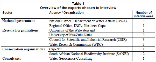 The following qualitative assessment of current groundwater management in South Africa is based on the results of a recent qualitative study. The research was based on semi-structured interviews conducted with 18 South African experts in the fields of groundwater resources and ecosystem services during November/December 2009.