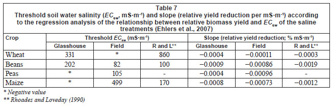 Ehlers et al. (2007) tested the thresholds for South African conditions using wheat, peas, beans and maize. Two experiments were conducted: A pot experiment in the glasshouse facility at the Bloemfontein main campus of the University of the Free State (UFS) and the other at the Field Research Facility of the Department of Soil, Crop and Climate Sciences (UFS). The second experiment used the field lysimeter facility at Kenilworth Experimental Field, about 15 km north-west of Bloemfontein (29º01'00''S, 26º08'50''E). The details on the materials and methods of these experiments are described in Ehlers et al. (2007). The results for one of the crops are presented in Fig. 9, viz. a linear response relationship between relative biomass yield and EC of the soil water. The results of the intercept (threshold ECsw, mS·m-1) and slope (relative yield reduction per mS·m-1) represents the threshold which is calculated by means of Eq. (1). The thresholds of peas and 3 other crops are summarised in Table 7. From the results it is clear that the crop-specific thresholds and slope differ between the 2 experiments conducted by Ehlers et al. (2007). These thresholds also differ from those published by Rhoades and Loveday (1990; Table 7).