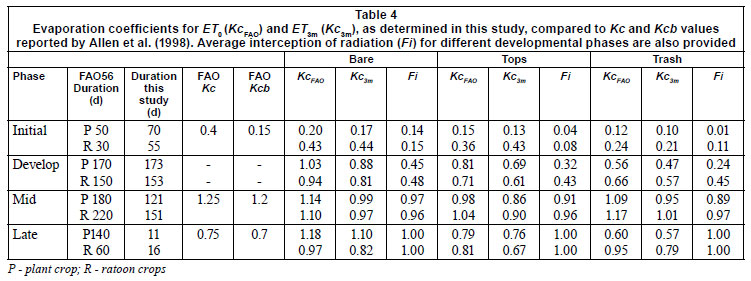 The KcFAO values for the Late Season phase for the Bare treatment were substantially higher than the FAO56 recom mendation (Table 4), confirming a similar result from Inman-Bamber and McGlinchey (2003). The duration of this phase was also substantially shorter than suggested by FAO56. We believe that this phase only starts when the 'drying-off'; process is initiated, after the last irrigation.