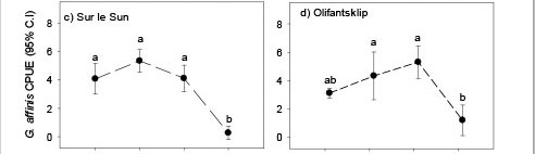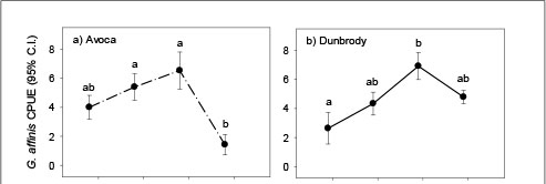 The GLM assessing potential biotic and abiotic drivers of G. affinis CPUE showed water temperature to have a significant effect on G. affinis during the course of the summer and winter. This phenomenon reflects the normal life history pattern that G. affinis has adapted to, whereby breeding and the production of clutches of juveniles peak in the warm summer months (Pyke, 2005). The strong link between temperature and population dynamics suggest it is the primary controlling factor, which may supersede the influence of other abiotic and biotic factors on the species, particularly during winter.