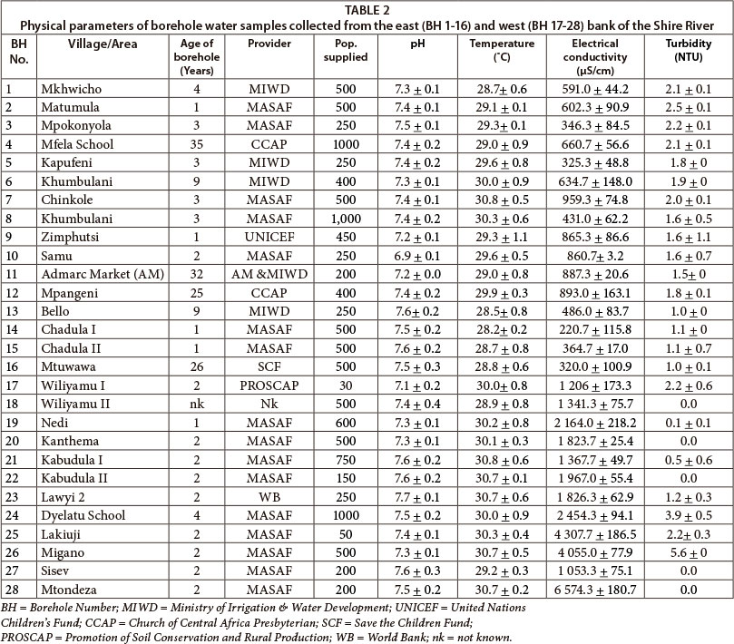 The physical parameters and results of the chemical concentrations detected for each borehole water sample are presented in Tables 2-4. Little difference was observed between the range of pH (6.8-7.9) and temperature (28.1-31.5°C) of water samples recorded in situ from both banks of the Shire River. The range of pH values recorded comply with the Malawi Standards (MBS) maximum permissible levels (MPL), i.e., range 6.0-9.5, for borehole water supplies (MBS, 2005). The pH and temperatures recorded are in accordance with those expected for borehole water supplies in Malawi (Chilton and Smith-Carington, 1984; McFarlane and Bowden, 1992; Palamuleni, 2002; Sajidu et al., 2008) and Africa (Langenegge, 1994; Bordalo and Savva- Bordalo, 2007).