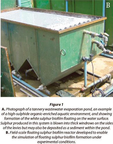 Actively growing floating sulphur biofilm was sampled from both tannery ponding systems (Fig. 1A), and a laboratory reactor (Fig.1B) that was fed organic sulphide-enriched water generated in a degrading packed bed reactor as described by Molwantwa et al. (2007). Aliquots of these biofilms (500µℓ) were mixed with 500 µℓ of glycerol and frozen at -70oC until used.