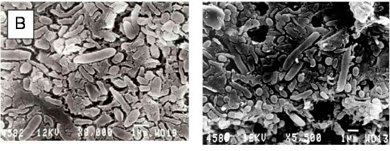 Figures 5B and 5C show the appearance of sulphur bands in the tubes after 1 day and 7 days of growth, respectively. Figure 6 shows scanning electron micrographs of samples from the top, middle and bottom of the gradient tubes and indicates differentiation of the microbial populations within separate bands. The upper layers consist mainly of cocci, while mainly bacilli and filamentous microorganisms occur in the middle and lower layers. Molecular phylogenetic analyses of the actual population structures established by this method were undertaken and are to be reported elsewhere.
