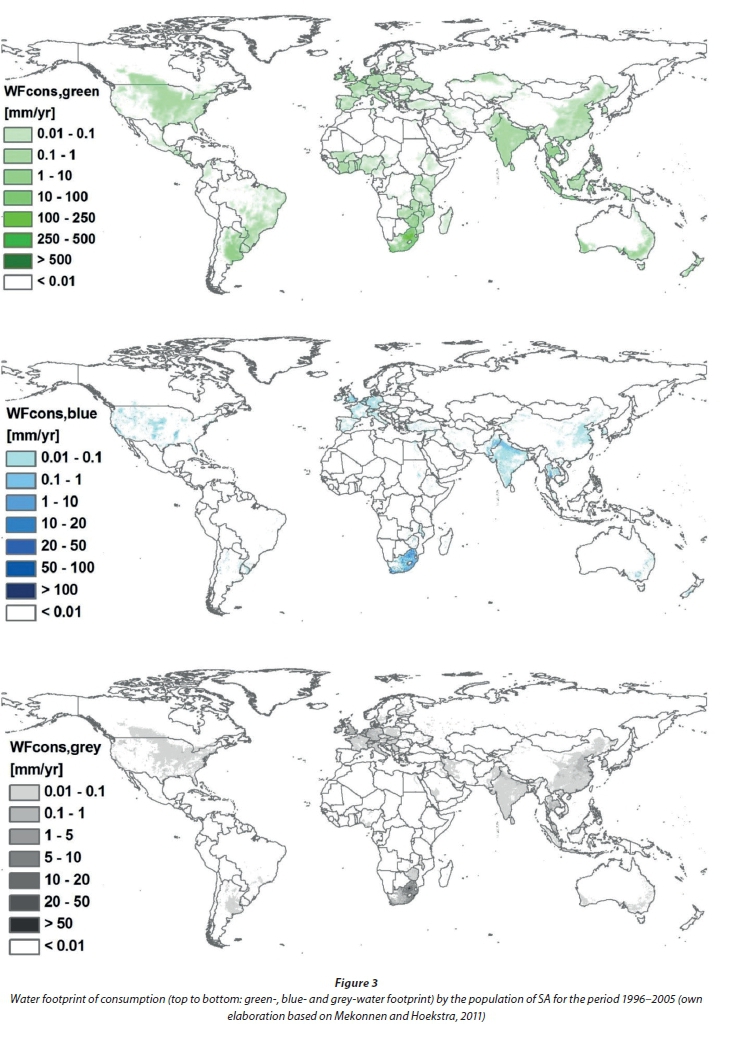 Figure 3 shows the geographic distribution of the green-, blue- and grey-water footprint of consumption by South African citizens. Please note that values less than 0.01 mm/yr have been excluded in order to provide a clearer picture of the most important regions regarding the water footprint of consumption.