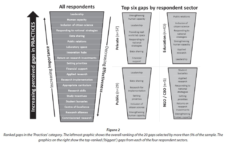 The largest gaps in 'Practices', where items of high importance contrasted with low effectiveness, were perceived as 'Leadership' and 'Strengthening human capacity', (Fig. 2). These two gaps received the strongest support from the public and private sectors. 'Data sharing' constituted the next greatest gap, followed by 'Public relations'. The smallest gaps, conversely, related to 'Study incentives' and 'Student bursaries', 'Centres of Excellence', 'Research alliances', and 'Commissioned research'.
