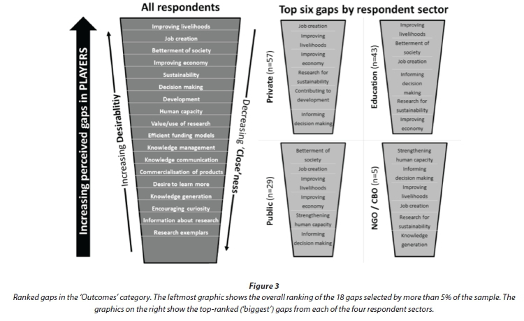 The four greatest gaps identified in desirable outcomes of innovation are interrelated - improving livelihoods, creating jobs, improving the economy, and bettering/improvements for society. These are the ultimate outcomes of any well-functioning innovation system and have particular relevance in SA's developing context. Research for sustainability, the next-largest gap, has resonance with what Thomas and Ford (2005) termed a crisis in innovation for water - the need for technologies and techniques for sustainable use of water resources is pressing. Once more, the traditional targets of interventions - knowledge generation and the provision of information about research - are ranked as the least important of the identified gaps in the innovation system.