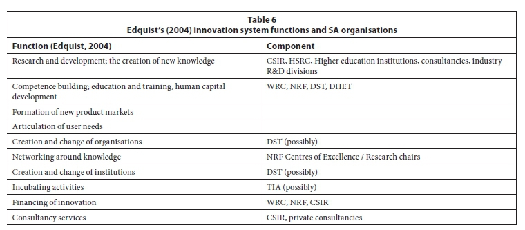 In terms of the innovation system functions described by Edquist (2004), the water innovation system in SA has gaps in many major respects, not least within formal organisations. Table 6 shows the organisational components of the innovation system, aligned with their key mandated functions.