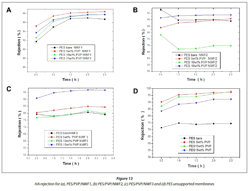 Figure 13 shows the HA rejection results for the PES membranes supported on NWF1, NWF2 and NWF3. The membranes supported on NWF1 showed high rejections of the HA pollutant. This is due to the smaller pore sizes of the membranes (see Fig. 7). The size of a HA molecule ranges between 1600 and 20 000 g∙mol-1 (Wang et al., 2009). The maximum HA rejection values attained for the PES membranes supported on NWF1 were between 96.5% and 98% compared to 69% and 96%, respectively, for the NWF2- and NWF3-supported PES membranes. As expected, the incorporation of PVP as a pore former and hydrophilicity enhancer does not consistently produce high HA rejection but improves the flux. The PES/15wt% PVP supported on NWF2 and PES/15wt% supported on NWF3 membranes were found to follow the trend of high rejection whenever a high concentration of PVP was incorporated.
