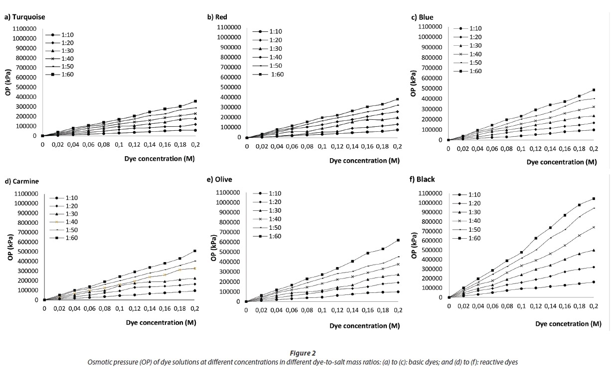 Figures 3 (a) to (f) represent the comparison of the OP of the different dye solutions at the same dye-to-salt ratio. For all the different dye-to-salt ratios the OP increases as the Mw increases. The Black dye with the higher Mw (991 g/mol) generated the highest OP compared to the Turquoise dye with lower Mw (359 g/mol). The Mw trend for each of the different dye-to-salt ratio graphs is Black > Olive > Carmine > Blue > Red > Turquoise. The trend for the OP for the different dye-to-salt ratio is 1:60 > 1:50 > 1:40 > 1:30 > 1:20 > 1:10.
