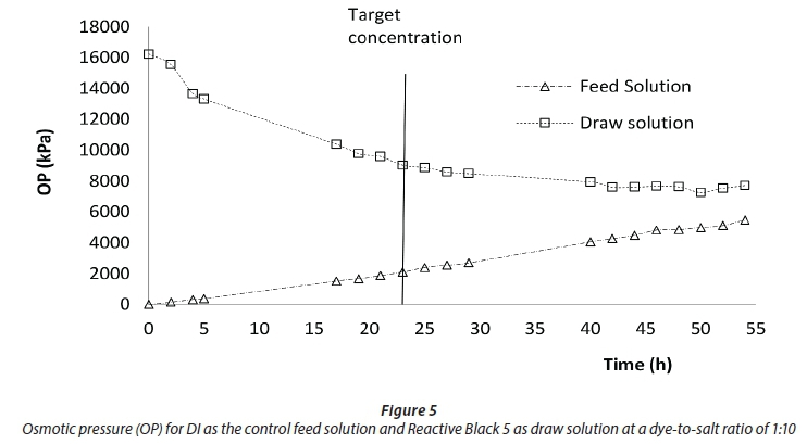 Figure 5 illustrates the OP of both feed and draw solutions over time. The initial OP gradient (i.e., driving force) was 16 586 kPa. The OP for FS increased over time while that of the DS decreased over time. The increase in the OP of the DI was attributed to reverse solute flux of the dye, while the decrease in OP of the DS was due to water flux across the FO membrane from the feed to the draw side, thereby diluting the DS. As shown in Fig. 5 the target concentration of 0.002 M was reached after approximately 23 h, corresponding to an OP of 8 580 kPa. From observation there was no futher change in the volume of both the feed and draw solutions and no change in the weight of the feed after approximately 55 h, where the final OP of the FS and DS was 5 468 and 6 667 kPa, respectively, with a feed water recovery rate of 60%.