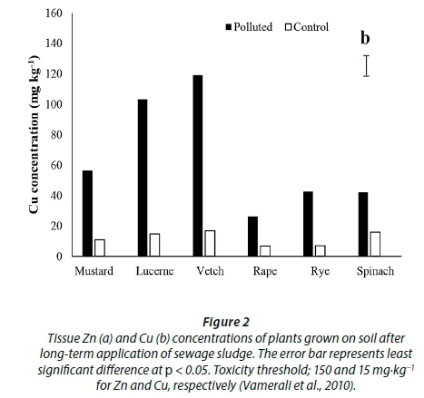 Mustard and rape had higher dry matter on the polluted soil than the control, while there were no differences for the other plants (Fig. 1). Mustard and rape had higher dry matter than all the other plants on both polluted and control soils (Fig. 1). Concentrations of both Zn and Cu (Figs 2a and b) were higher in the plants grown in the contaminated soil compared to the control. Lucerne and vetch had the highest concentration of both Zn and Cu for both soils.