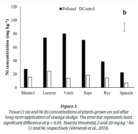 Cr and Ni (Fig. 3) were higher in the plants grown in the contaminated soils than in the control. Cr concentrations were above the limit in all plants grown on both soils. Ni was also above the limit in the polluted soil for all plants. Lucerne, vetch and rape had the highest Ni concentration (Fig. 3b).