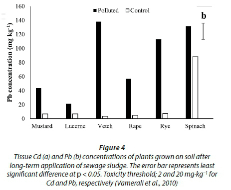 Rape and mustard had the highest Cd concentration (Fig. 4a). The plants grown in the control soil had lower concentrations of Cd with respect to the limit. Pb concentration was highest in vetch and rye (Fig. 4b). Tissue Pb concentrations were below the threshold for all the plants on the control soil.