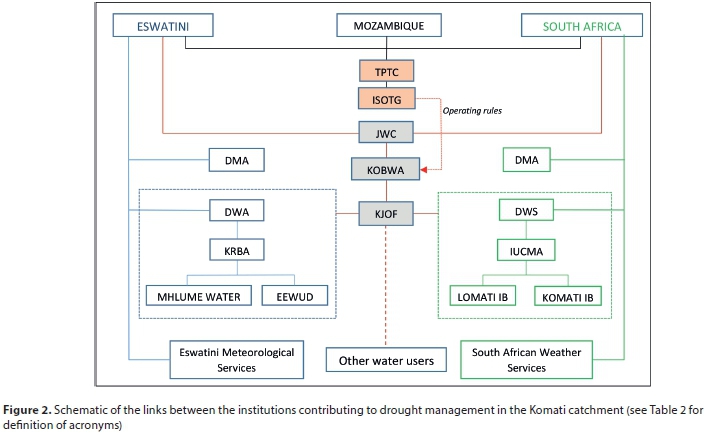 Other important institutions which contribute to drought management in the catchment are shown in Fig. 2 (see the Appendix for detailed roles of the institutions). These include Komati Joint Operation Forum (KJOF) and irrigation boards. The disaster management agencies (DMAs) in both countries facilitate the implementation of drought measures which are designed by the different sectors, such as agriculture and the water sector. The weather services in both countries provide weather and climate-related information.