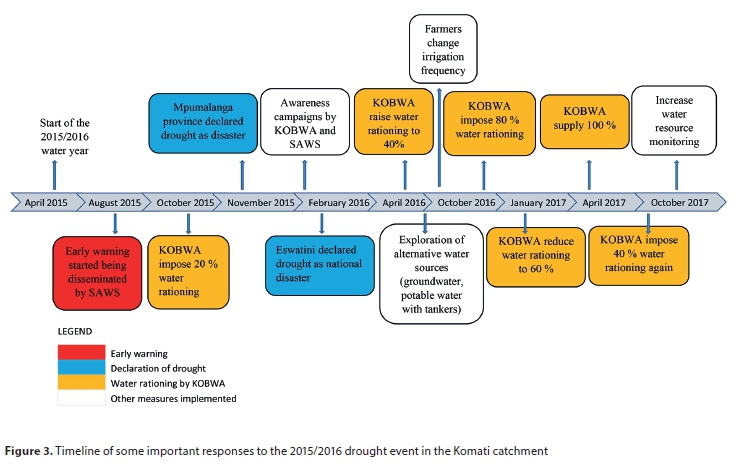 There were a number of different drought mitigation and adaptation measures that were implemented during the 2015/2016 drought in the Komati catchment. These measures were implemented at national, provincial and local levels. The planning of the measures was done by the different actors in coordination with the countries' disaster management agencies. Since there is no specific drought policy or drought preparedness plan for the KOBWA water management area, the countries' sectorial plans were implemented at the local level. Nevertheless, rationing of water supplies during drought is a policy action stipulated in the ISOTG rules, which needs to be tailored to a certain drought situation. KOBWA, together with other transboundary institutions, was responsible for developing drought measures for Maguga and Driekoppies Dams to make sure water users (irrigation and domestic) in Eswatini and South Africa were served. The main drought mitigation measures implemented in the 2015/2016 drought, as well as other important drought response mechanisms, are summarised in the timeline presented in Fig. 3. In this section we first present the responses by institutions and thereafter by water users.