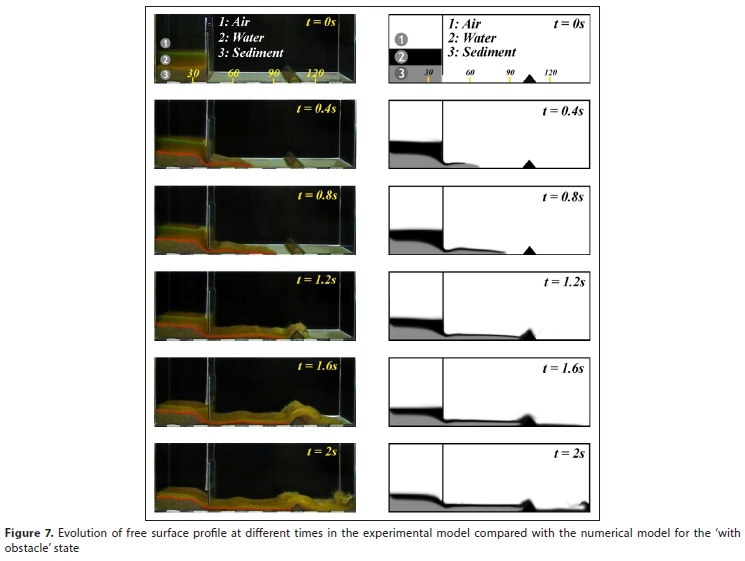 After the dam gate's sudden removal, the water flowed out along the dry horizontal bed in a downstream direction. In both numerical and experimental models, in the first state (without obstacle), at time t = 1.6 s, the front wave of water collided with the dam wall and propagated backwards. In the second state (with a triangular obstacle), at time t = 1.2 s, water, and at time t = 1.6 s, sediment, reached the obstacle. The water column passed over the obstacle; however, the sediment stayed behind it. In this state, at time t = 2 s, the front wave reflected against the dam wall and propagated in an upstream direction.
