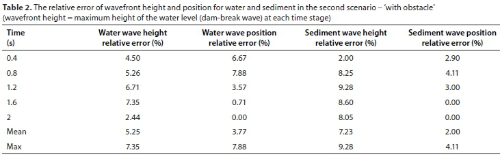 The average percentages of relative error for water and sediment height and position of wave flow, due to the sudden opening of the sluice gate in two scenarios, without obstacle and with a triangular obstacle, are presented in Tables 1 and 2 at time steps of 0.4, 0.8, 1.2, 1.6 and, 2 s. In general, the relative error of the wave position of water and sediment is acceptable (less than 3% for the water phase and less than 2.5% for the sediment phase). Hence, it can be concluded that the numerical model for this flow achieved an appropriate performance in the simulation of the position of the water and sediment wave. However, there is a slightly greater difference between the experimental and numerical results for the height of the water wave than the sediment wave (less than 5% for the water phase and less than 3% for the sediment phase.)