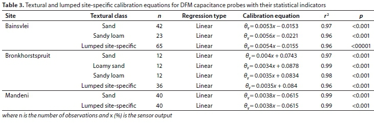 This study was undertaken to derive textural and lumped site-specific calibration equations for Dirk Friedhelm Mercker (DFM) capacitance probes and evaluate the accuracy levels of the developed calibration equations for continuous soil moisture monitoring in three selected soil types. At each site, 9 probes (3 per plot) were installed in 2 m2 plots, for continuous soil moisture measurements at 5 different depths (viz. 10, 20, 30, 40 and 60 cm) under dry, moist and wet field conditions. Textural site-specific calibration equations were derived by grouping the same soil textural classes of each site regardless of soil depth, while lumped site-specific calibration equations were derived by grouping all datasets from each site, regardless of soil depth and textural classes. Sensor readings were plotted against gravimetrically measured volumetric soil moisture (0v) for different textural classes as a reference. The coefficient of determination (r2) was used to select the best fit of the regression function. The developed calibration equations were evaluated using an independent dataset. The results indicated that all developed textural and lumped site-specific calibration equations were linear functions, with r 2 values ranging from 0.96 to 0.99. Relationships between the measured and estimated 0v from calibration equations were reasonable at all sites, with r 2 values greater than 0.91 and root mean square error (RMSE) values ranging from 0.010 to 0.020 m3-m-3. The results also indicated that textural site-specific calibration equations (RMSE < 0.018 m3-m-3) should be given preference over lumped site-specific calibrations (RMSE < 0.020 m3-m-3) to attain more accurate 0v measurements. The findings of this study suggest that once DFM capacitance probes are calibrated per site, they can be reliably used for accurate in-situ soil moisture measurements. The developed calibration equations can be applied with caution in other sites with similar soil types to attained reliable in-situ soil moisture measurements.
