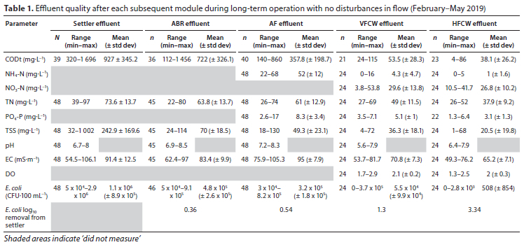 The effluent quality of each module over the monitoring period is given in Table 1. For the calculation of loading and mass removal rates, the HLR of 0.16 m-d-1 was used. The average CODt concentration in the settler was 927 ± 345.2 mg-L-1, equating to a loading rate of 148.3 gCODt-m-2-d-1. The bCOD (soluble and particulate fractions) was estimated to be 760 mg-L-1 from the OUR analysis (Table A2). Nutrient loading, measured only by total nitrogen, was 11.8 gN-m-2-d-1. The average E. coli colony count was 1.1 x 106 (± 8.9 x 105) CFU-100 mL-1. Since it is expected that primary treatment via sedimentation and flotation would have already occurred in the settler before sampling, this is not a true representation of the raw wastewater characterisation.