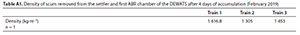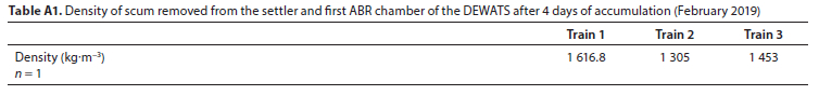 The density of scum removed ranged from 1 305-1 616.8 kg-m-3 across the three ABR trains with the highest density removed from Train 1 (Table A1). The higher scum density in Train 1 is assumed to be because Train 1 received the majority of the flow over the monitoring period in relation to the total flow into the DEWATS (Fig. A4, Appendix). The depth of the scum layer was approximately 0.05 m, covering most of the outlet pipes of the settling chambers.