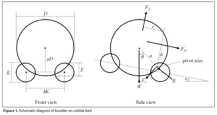 The situation analysed is of a boulder with nominal diameter D resting on bed particles with nominal diameter K (Fig. 1). The centroid of the boulder is a distance µD above the centroids of the supporting particles, and the distance between the centroids of the two supporting particles defining the pivot axis is AK. The boulder may be embedded with its bottom a distance E below the tops of the supporting particles.